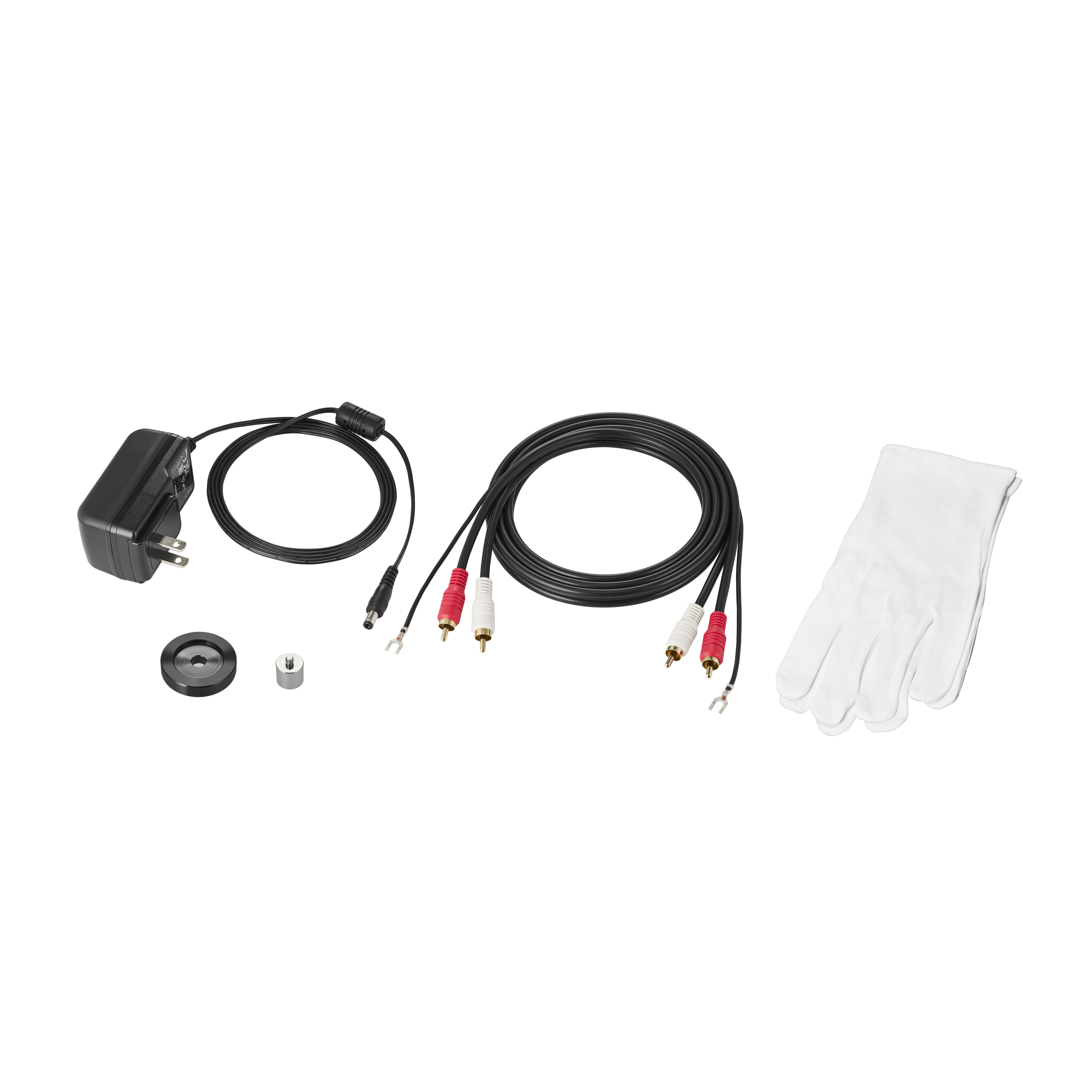 | Accessories Included | ・Dust cover ・Platter ・Drive belt ・Counterweight ・Subcounterweight (light) ・Headshell (AT-LT10) with VM stereo cartridge (AT-VM95E BK) ・45 RPM adapter ・RCA audio cable (Approx. 1.4 m (4.6’)) ・AC adapter (Approx. 1.3 m (4.3’)) ・Gloves |