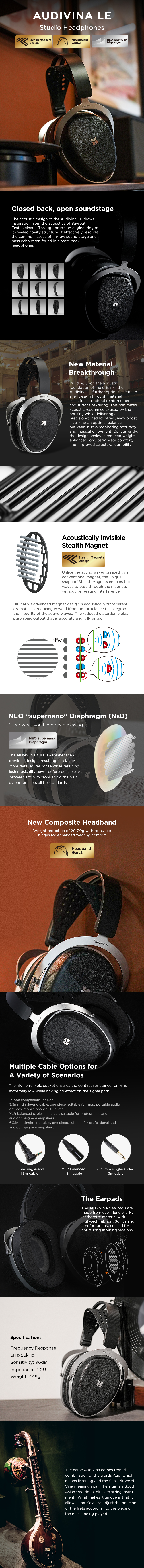 - Closed back, open soundstage. The acoustic design of the Audivina LE draws inspiration from the acoustics of Bayreuth Festspielhaus. Through precision engineering of its sealed cavity structure, it effectively resolves the common issues of narrow sound-stage and bass echo often found in closed-back headphones.