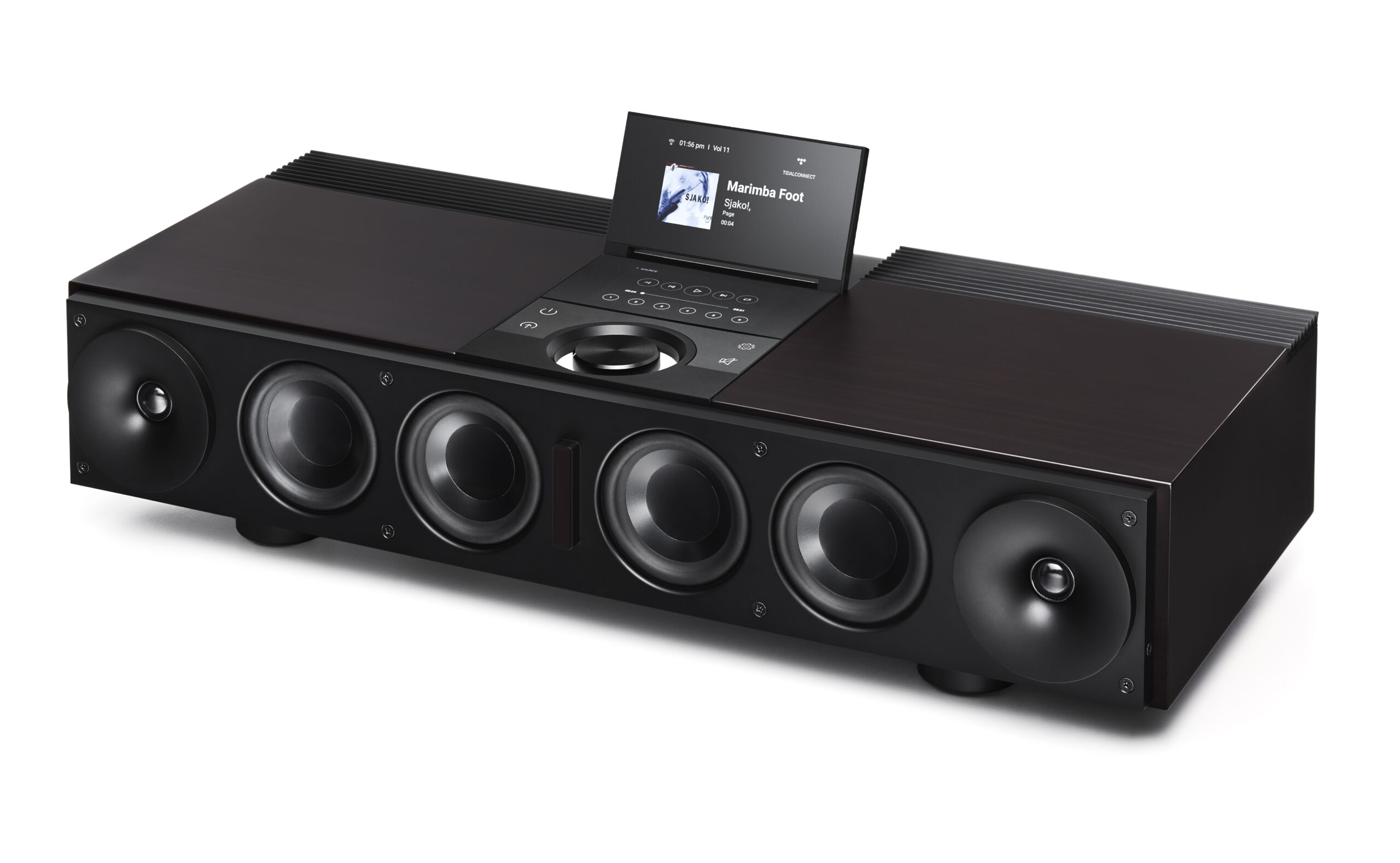 The speaker array of six low-frequency drivers (two front-firing, two rear-firing, and two down-firing), paired with dual midrange and two high-frequency wave-guide drivers are driven with a 300-watt DSP controlled amplifier to ensure prodigious dynamics and nuanced detail.