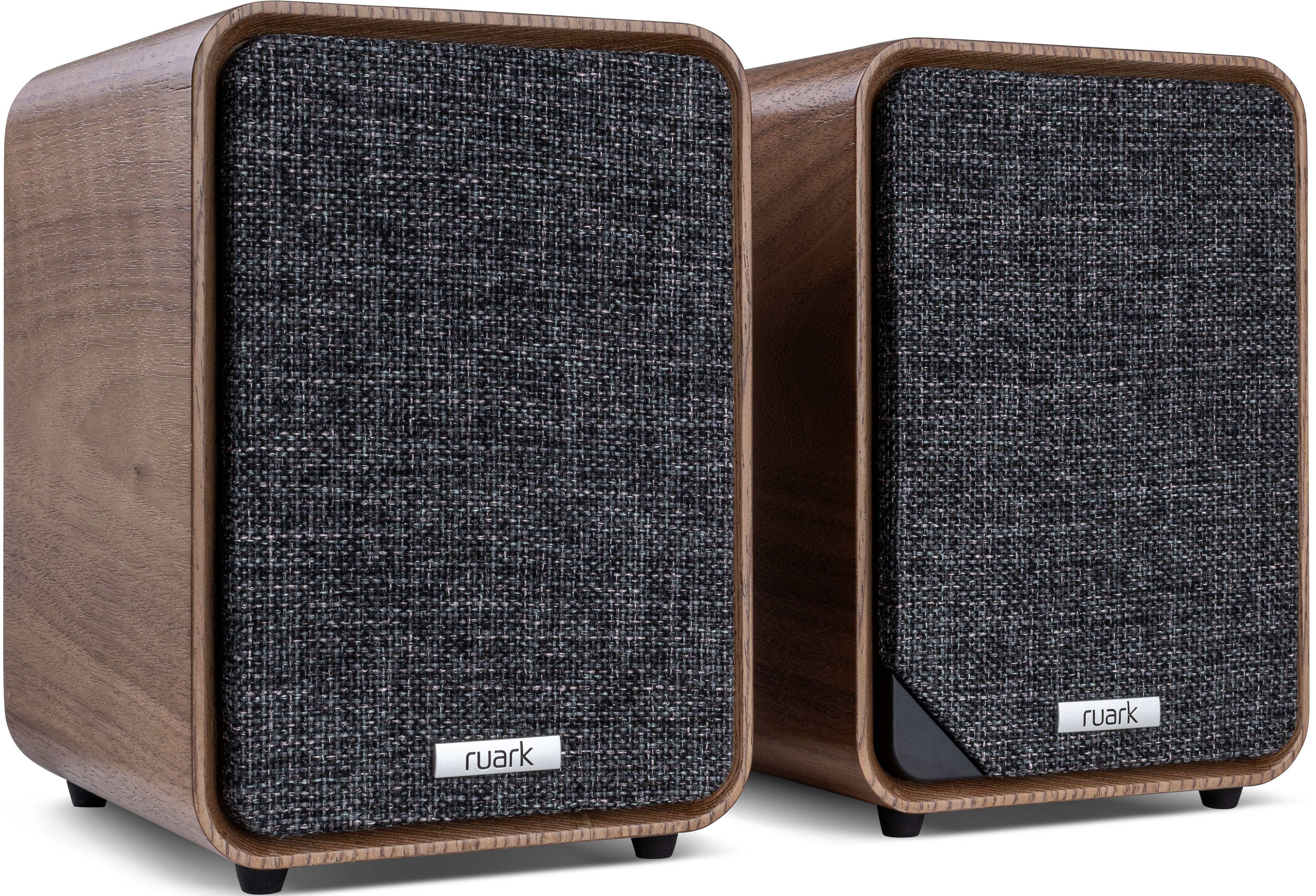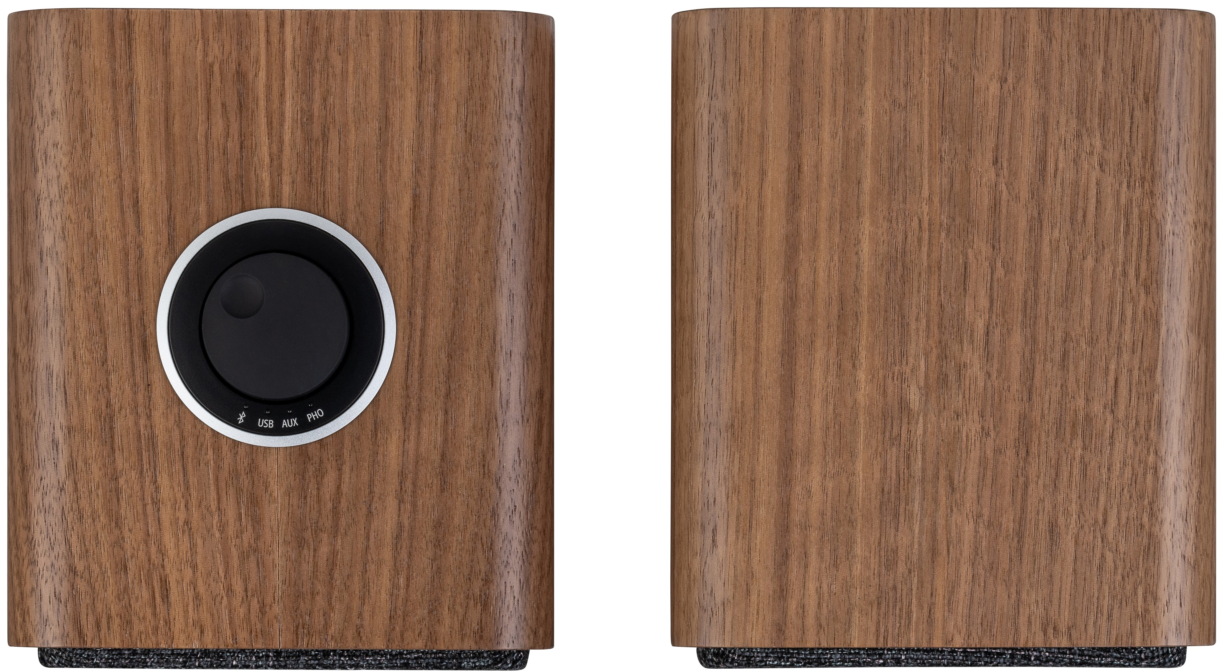 - Finishes: Rich walnut veneer or charcoal lacquer with dark slate woven fabric grille