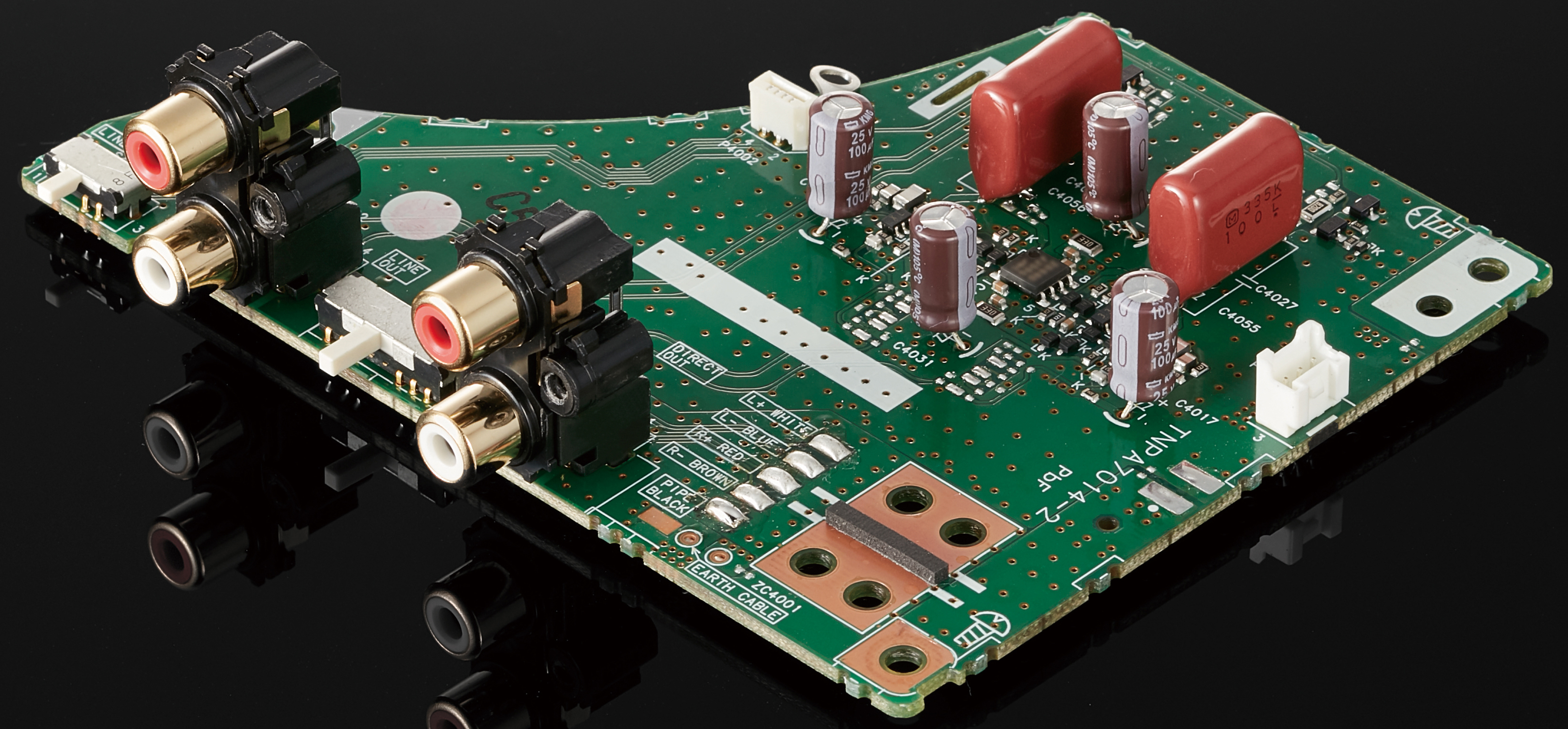 To preserve purity, the phono EQ circuit was refined through repeated listening tests. For high-quality, low-noise sound, shielding, dedicated ± power supplies, and separate grounding reduce interference.
